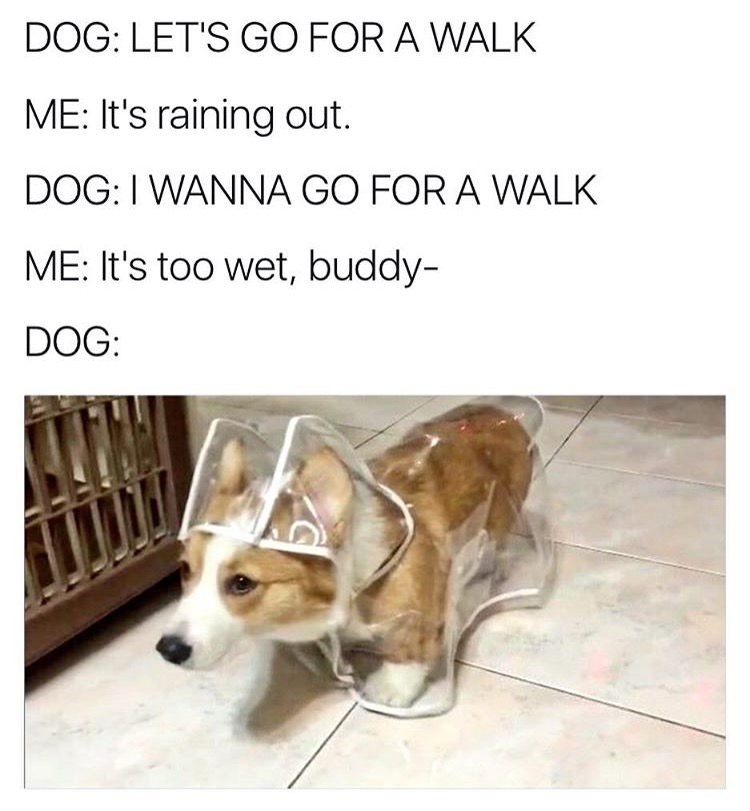 This determined dog is not taking no for an answer as it is ready to go for a walk no matter what. This little buddy's persistence along with its raincoat and aww-dorable face has turned the rain-soaked dilemma into an adorable moment.