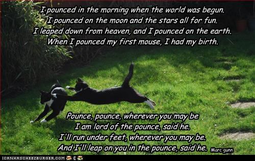 I pounced in the morning when the world was begun. I pounced on the moon and the stars all for fun. I leaped down from heaven, and I pounced on the earth. When I pounced my first mouse, I had my birth. Pounce, pounce, wherever you may be I am lord o
