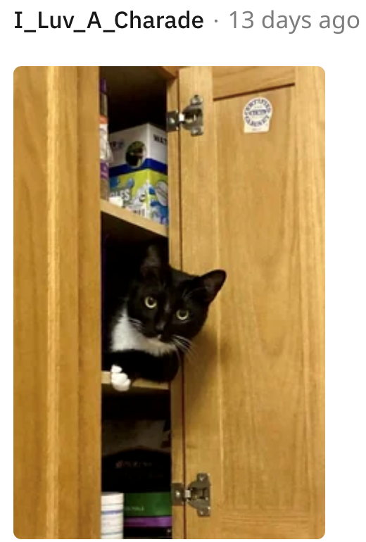 What are you looking at? We're sorry we couldn't invite you to our cupboard pawty - the guest list is quite exclusive and you haven't been giving us enough tuna to be accepted. There's always next month though! Better go stock up, the guest list is filling up fast.