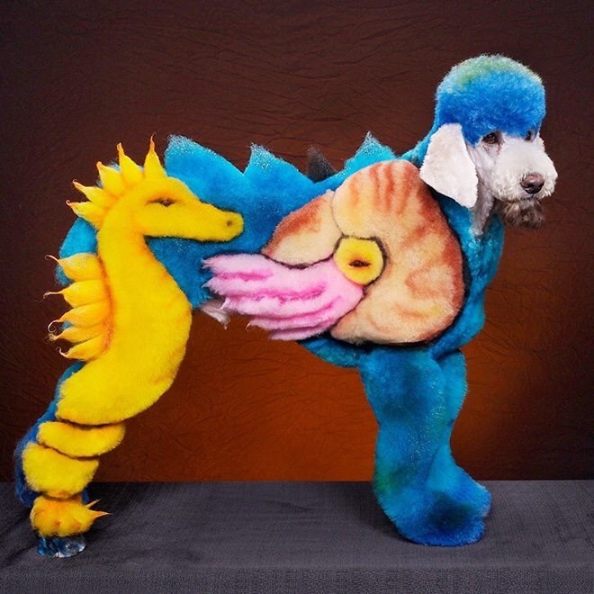 Say what you will, but this is pretty cool. We're sure that this doggo is not too pleased about being turned into a portrait of a seahorse and some ancient sea creature in the ocean, but he does look pretty punk with that mohawk and the blue hair. Not a bad look for this doggo!
