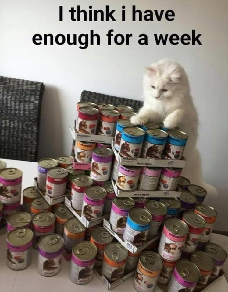 Now this is the kind of meal prep we like, this fluffy feline on top of this mountain of cat food is so mischievous it purrfectly captures the playful essence of the kitty's behavior as it looks at all its meal choices.
