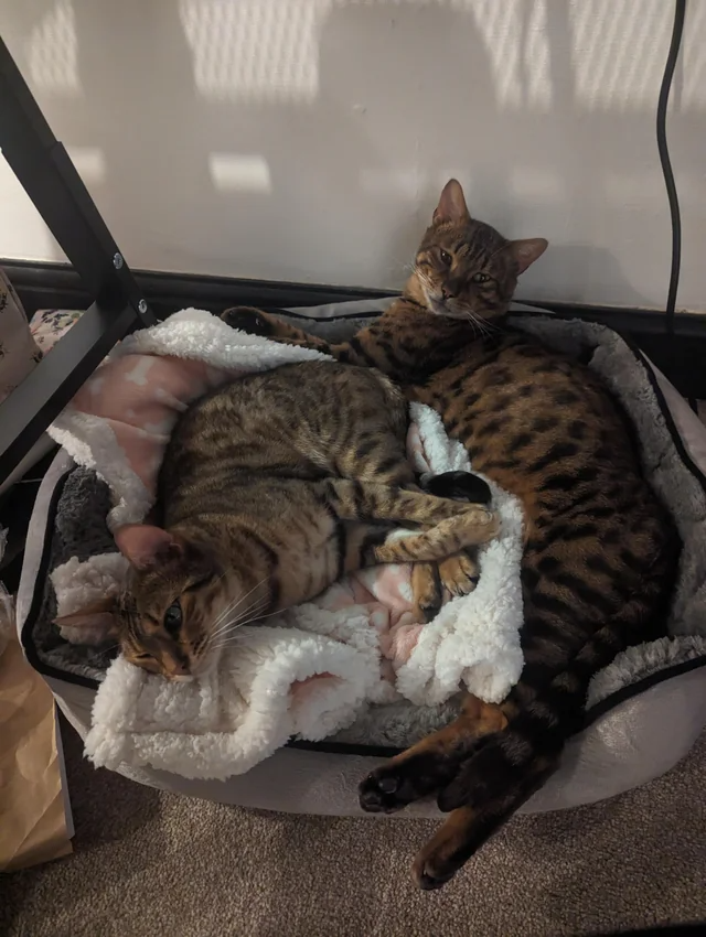 "We adopted a father (Tigger) and daughter (Molly) duo. Tigger adores Molly but he has been very scared of us. We think he was ab*sed by his previous owner and used as a stud. He started to let me sit next to him and stroke him without him freaking out. Last night while I was watching TV in bed he sat between my legs, stretched out and laid his head on my leg, he's the long boi in the picture, if he's sitting up and I rub his belly sometimes he'll just lay down and roll over for my belly rubs. He still won't purr, he's a silent cat (but I've caught him making gentle biscuits in the air) he only yowels for Molly because he misses her. She's never far, but she's a sassy b*tch, she sits with us and ignores him. Molly took no time at all settling with us, Tigger still isn't 100%, but he's showing progress. I just wanted to share how happy I am"