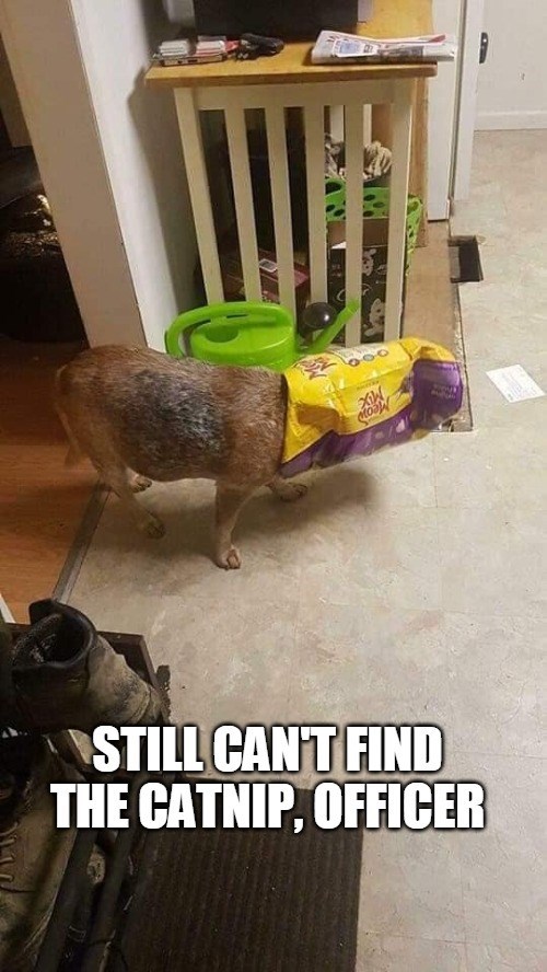 Thank you, Officer Sniffer, for being so diligent as to check to the bottom of every single food bag to find the contraband catnip. If we had one word of advice, though, we think you might want to take your head out of the bag when you have finished inspecting it. Just a thought, though. Keep on doing the good work.