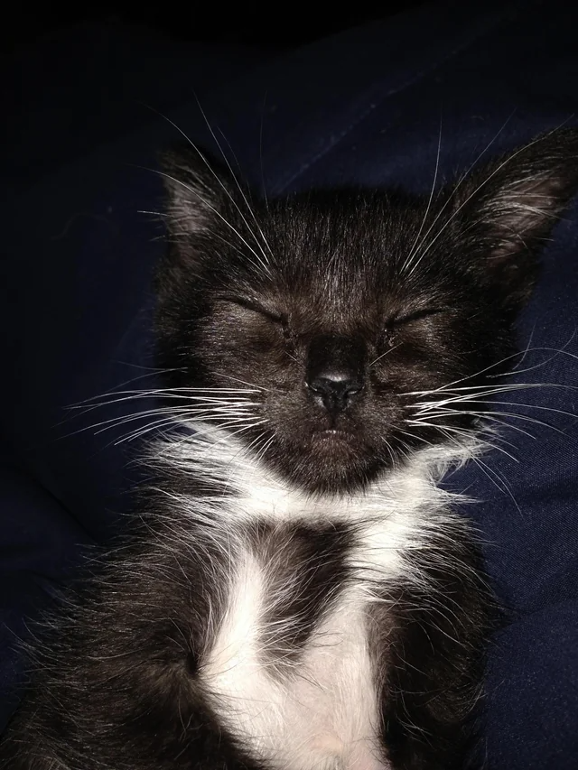 'This is Bear on the day he followed my mother home from one of her walks. He was hiding from the rain under a storage container. I estimate he was about 5 weeks. His eyes were still bluish. He's 2.5 years now, a bit emo and with a healthy appetite!'