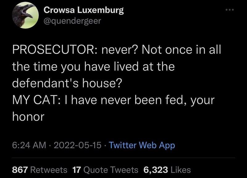 Objection! The Prosecution would like to bring exhibit A to the stand. What, you may ask, is exhibit A? Well, it happens to be the defendant's food bowl, and as you can see, there is still food inside of it! In fact, the food bowl is full! The defendant is a liar and we demand this case be dismissed immediately.