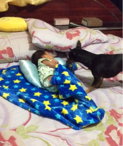 The Chihuahua continues swaddling the baby until he’s sure that every inch of her is covered—he doesn’t want her to get cold while she’s sleeping