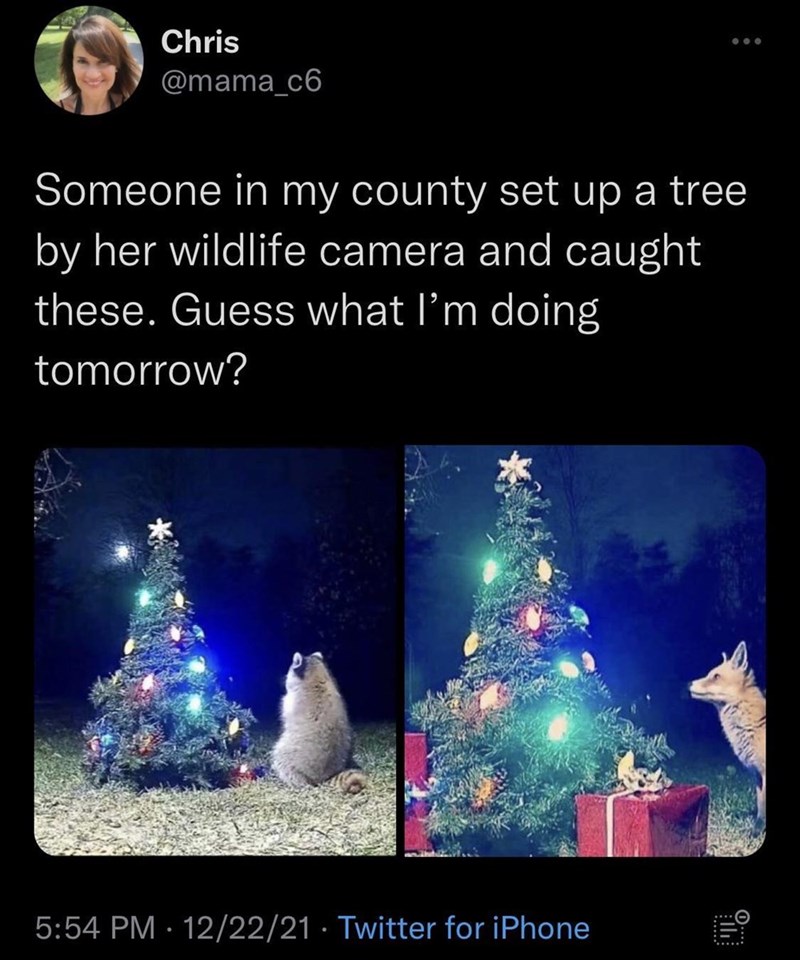 Excuse us while we go set up a Christmas tree in our backyard right now! This is so incredibly wholesome and we have always had a Snow White complex where we think wild animals will just come to us and be our friends. All we were missing was a Christmas tree in our backyard! Who knew?