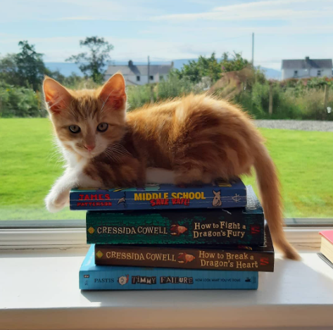 A precious kitty, snug as can be, perches atop a tower of books, turning them into a purrfectly comfy throne. It's a delightful surprise to witness how these books have become the ultimate sanctuary for this awwdorable ball of fur.