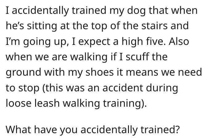 Of all the things to accidentally train, a high five is a pretty happy accident. That sounds adorable, doesn't it? Every time you come up the stairs you get a high five from the dog - it's like having your own personal cheerleader. All they are missing is a few pom-poms and the whole fantasy is complete.