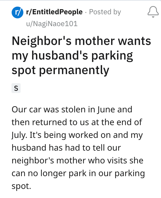 #1: This neighbor who thinks she's entitled to OP's parking spot