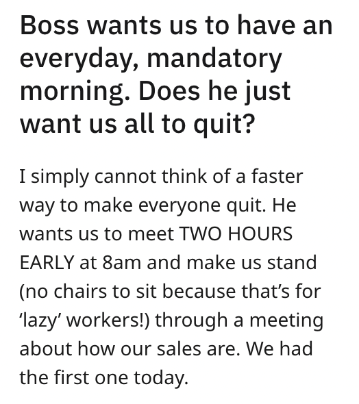 ‘Does he just want us all to quit?’: Boss enforces mandatory two-hour stand-up meeting at 8:00 am every day, worker rebels