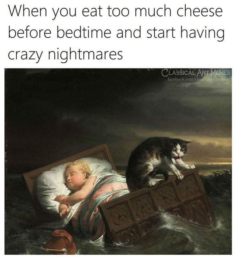 If there's one meme in the world that we can relate to, it's this one. We're guilty of snacking on some cheese before bed, and every time, seriously, every time, we have crazy nightmares. You would think that we would learn after a couple of times, but we can't resist that late-night cheese snack. It's too gouda.