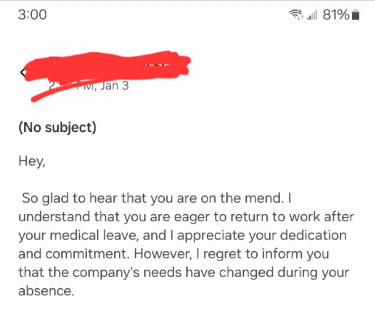 HR Fires Employee While on Medical Leave: 'the company's needs have changed during your absence'