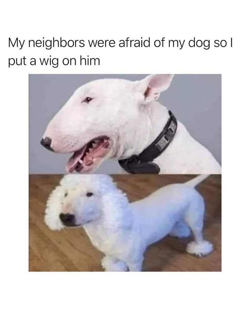 A great trick for public speaking, replacing the relatively vulgar option of imaging your audience without clothes. This puppy pawrent's solution to subduing their neighbour's fear of their dog is absolute genius. So the next time you have to stand up and speak in a meeting, imagine everyone is wearing funny wigs.