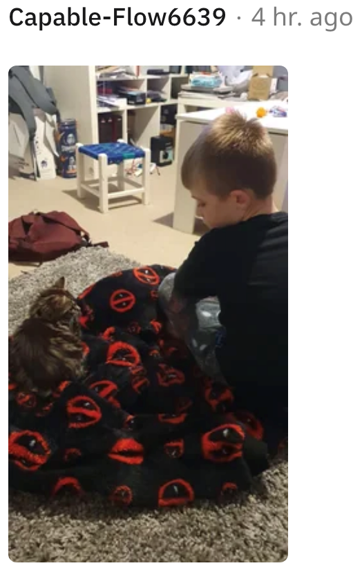 When you think of a cat's bestest friend, you probably think of another pet (like a doggo) or something, but our kitten's bestest friend was always our son! They did everything together, especially nap time. They snuggled up like two bugs in a rug and were never happier!