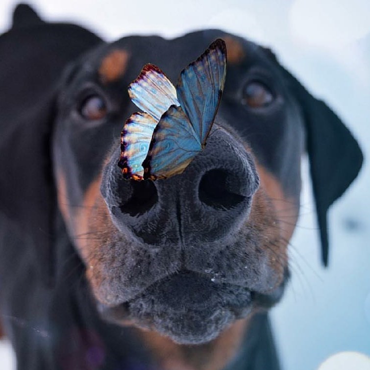 A rare and awww-inducing butterfly boop! We would boop this snoot, but the butterfly beat us to it, and the rules clearly state that whoever boops the nose first gets priority. It's okay, we can wait. This doggo doesn't look like he's going anywhere and we're sure he would appreciate another boop!