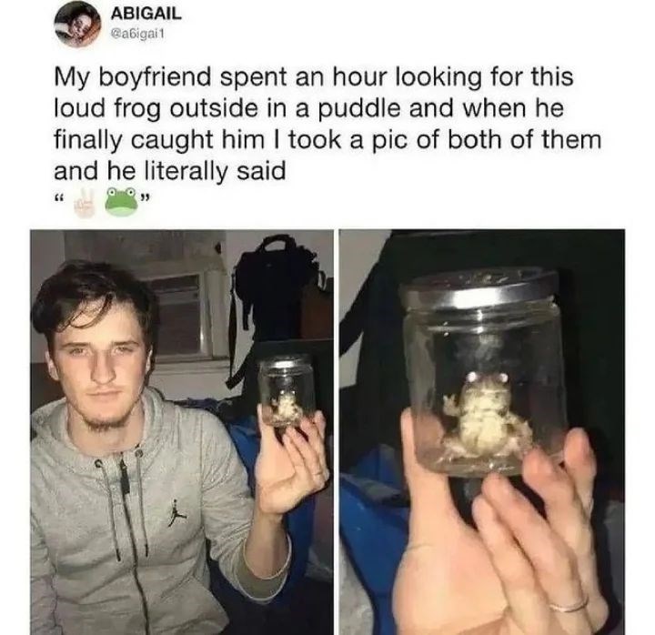 Now that is one heck of chill frog. What animal or hooman could you imagine being this chill about being taken out of their 'hot tub' and placed in a glass prison cell and still be this chill. Come to think of it this frog might be throwing the peace sign as a way of calling a truce to let him go…