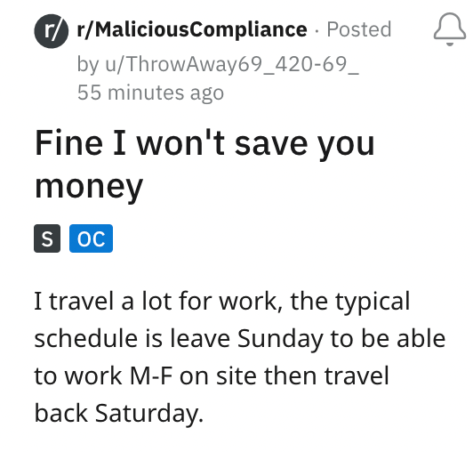 'Fine, I won't save you money': Company denies traveling worker's per diem after he checks out of hotel early, cue malicious compliance