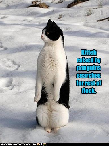 Kitteh raised by penguins searches for rest of flock.