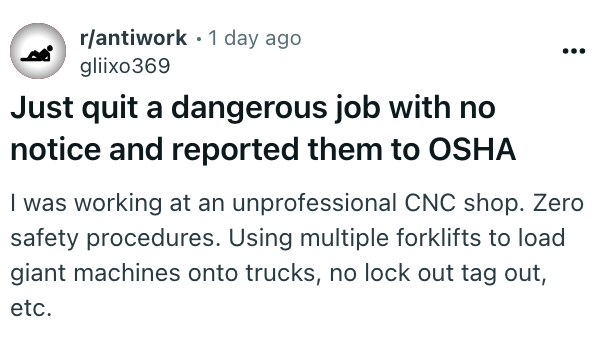 'Keep your mouth shut to the people willing to even work there': Employee rage quits and reports his company to OSHA after getting written up for breaking arbitrary ‘rules'