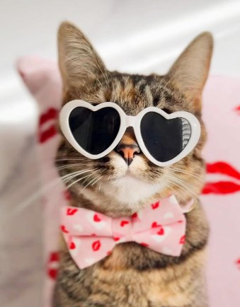 This cute cat looks super stylish and ready to celebrate the month of love with heart sunglasses and a cute bow tie covered in red and white kisses. We could learn a thing or two about style from this awwdorable kitty!