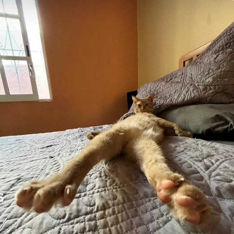 That's a biiiiiiiiiiiiiiiiiiiiig stretch right there! We can't really explain it in words, but this picture brings us so much joy. Maybe it's the length. maybe it's the stretchy toe beans. Maybe it's the angle. Whatever the reason, it's pure purrfection.
