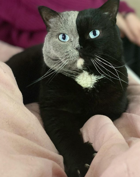 This extraordinary cat may catch your eye with its distinctive split fur – one side black, the other gray – complemented by its mesmerizing blue eyes. Despite its unusual appearance, this remarkable pet is full of beauty with its one-of-a-kind pattern and captivating charm.