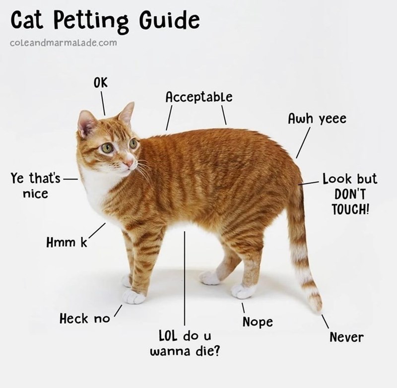 Now, this is one of the most important pieces of information that you could ever have about a cat. Now, there is a chance that your cat may not be exactly like this, but it is a very solid general guideline for where and where not to pet your cat. Though, it should be delivered alongside and explanation of what different feline tail movements indicate.