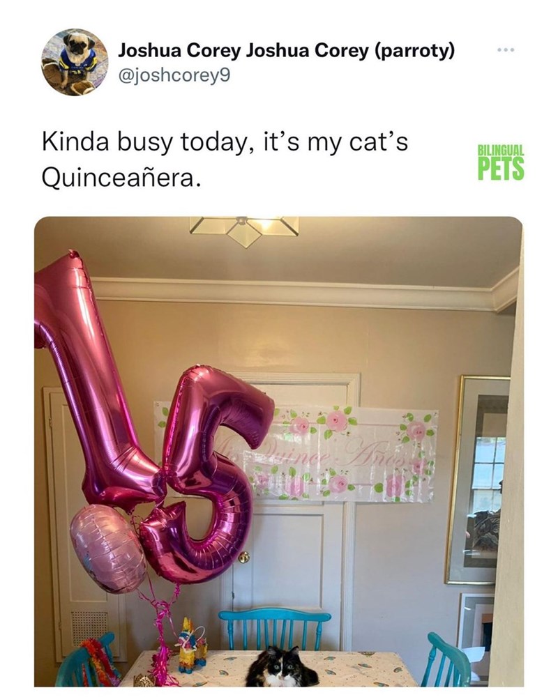Now that is what we call a distinguished feline quinceañera. What a marvelous and appropriate way to celebrate a cat's life, especially for having reached such a ripe age. That being said, the cat looks less impressed than your boss after being handed a PowerPoint that was designed by a five-year-old.