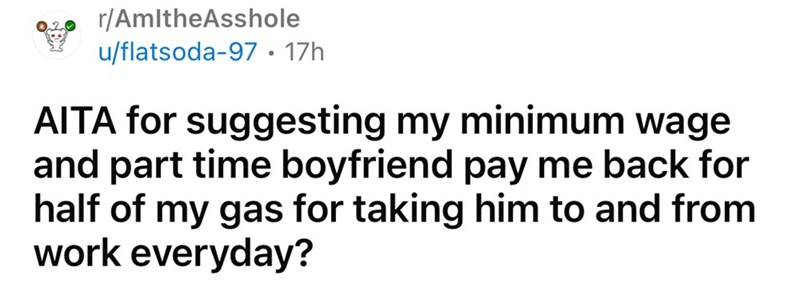 Freeloading boyfriend refuses to pay $120 for gas money, expects girlfriend to be his chauffeur: 'Why is a 36M still working part-time and without a car?'