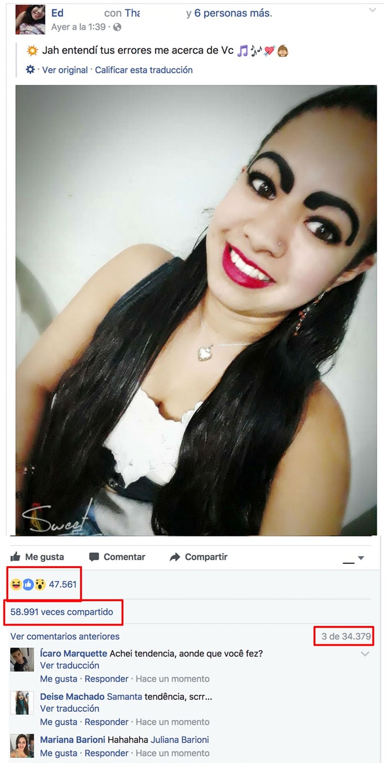 La historia es esta: una chica en Brasil decide subir una foto con sus nuevas y relucientes cejas e internet no ha parado de comentárselas.