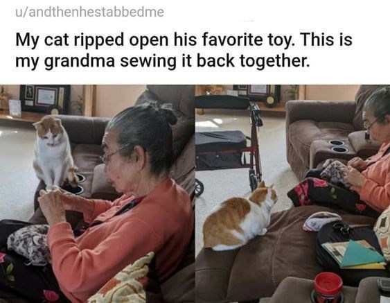 This is the same grandma or mother that keeps saying she doesn't like the cat and doesn't want the cat interfering with her whenever she does things. Same person. They can say what they say all they like, but we see them. We know. No one can withstand the cuteness of a cat.
