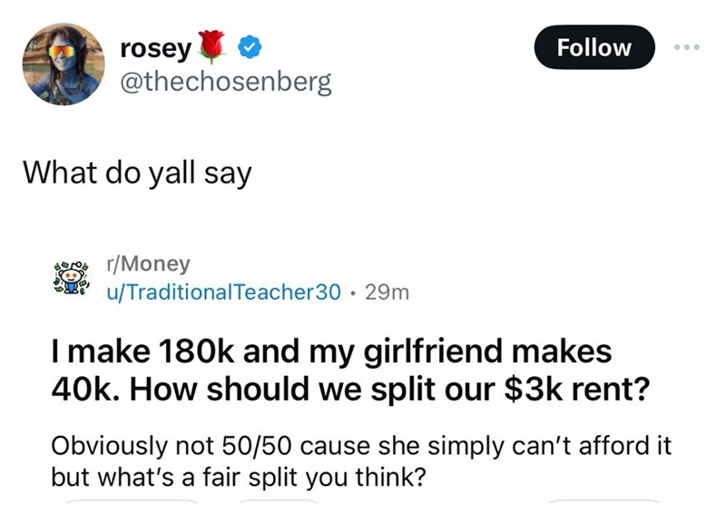 'He should pay it all': Renters debate how couple making $180K and $40K respectively should split their rent