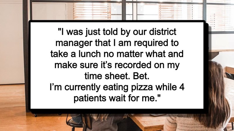 "I was just told by our district manager that I am required to take a lunch no matter what and make sure it's recorded on my time sheet. Bet. I'm currently eating pizza while 4 patients wait for me."