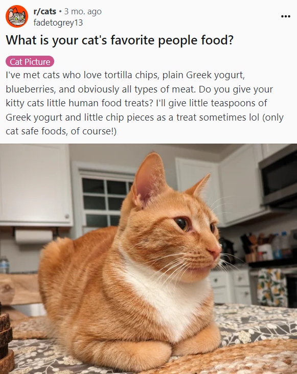 Hmm, Greek yogurt and chips. Two questions arise from this. First, does she feed her cat the two foods together? As though it were sour cream and chips? And second, how much fancier can you get? We can totally see this spicy orange boy rejecting any other kind of yogurt other than Greek now.