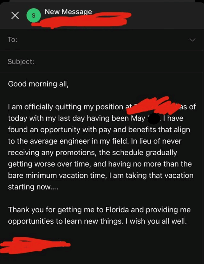 This worker shared the resignation they were planning on sending to their boss after landing a new job with better pay and benefits, detailing how they were going to tell their boss that their last day would be today before outlining their grievances and the reason for their departure.