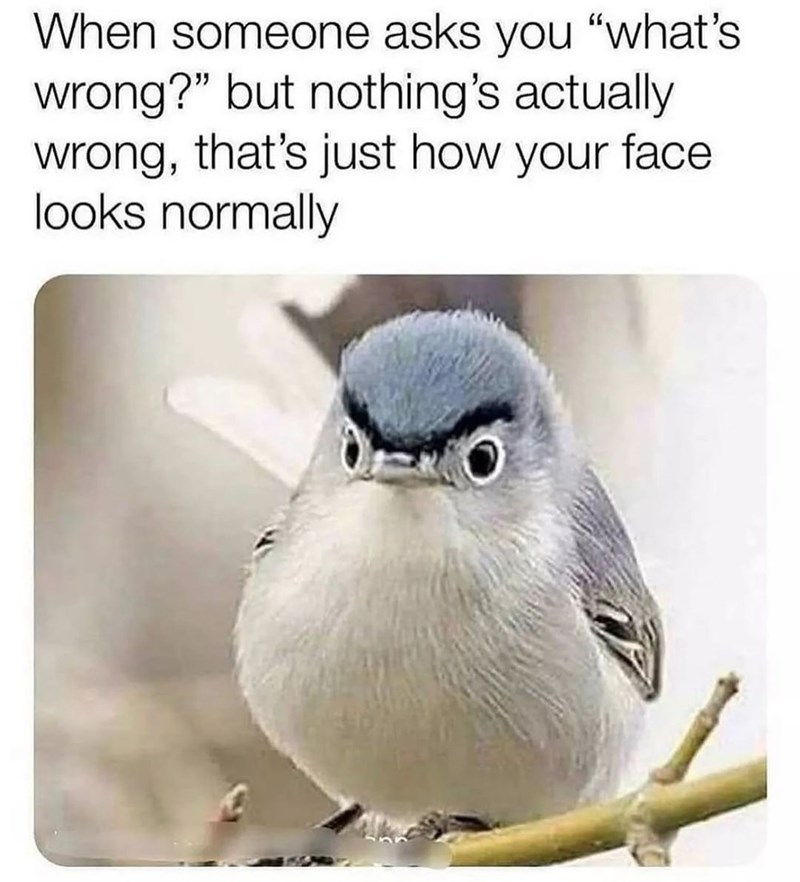 It is the one draw back to being an introvert, you are less aware of the faces you pull, because aside from your fur baby, few people see your facial expressions. So we most certainly feel for this bird, who likely has no control over its expression and will always come off a bit stand-offish…