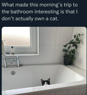 Imagine waking up to find a cat lounging in your bathtub, only to realize you don't even own a cat! That's the hilarious situation someone found themselves in this morning. It seems this furry friend decided to make themselves at home, leaving the unsuspecting homeowner scratching their head in confusion.