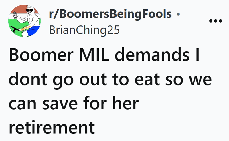 Boomer mother-in-law demands son doesn't go out to eat so he can save for her retirement: 'Brian save your money, we have no 401k'