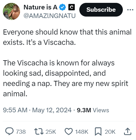 "Always looking sad, disappointed, and needing a nap"… yeah, we think this might be our new spirit animal ad well. It only makes sense. We're not always sad, disappointed, and needing a nap, but we kind of look like it. So… just like the Viscacha.