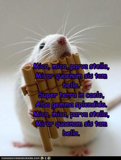 Mica, mica, parva stella, Miror quaenam sis tam bella. Super terra in caelo, Alba gemma splendido. Mica, mica, parva stella, Miror quaenam sis tam bella.