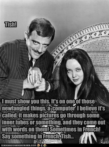 Tish! I must show you this. It's on one of those newfangled things, a 'computer' I believe it's called, it makes pictures go through some inner tubes or something, and they come out with words on them! Sometimes in French! Say something in Fr