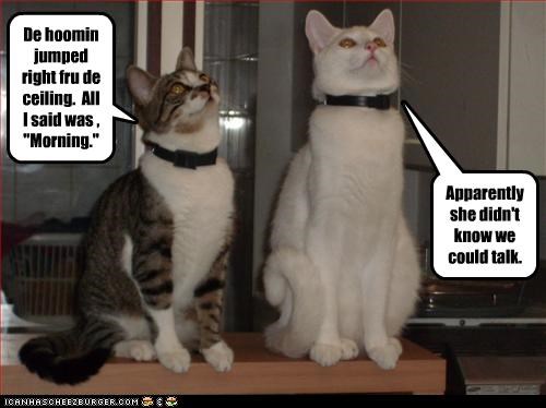 De hoomin jumped right fru de ceiling. All I said was , "Morning."