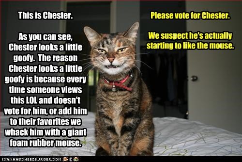 This is Chester. As you can see, Chester looks a little goofy. The reason Chester looks a little goofy is because every time someone views this LOL and doesn't vote for him, or add him to their favorites we whack him with a giant foam rubber mouse.