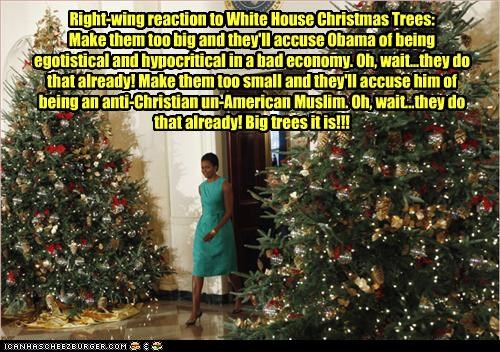 Right-wing reaction to White House Christmas Trees: Make them too big and they'll accuse Obama of being egotistical and hypocritical in a bad economy. Oh, wait...they do that already! Make them too small and they'll accuse him of being an anti-Christian u