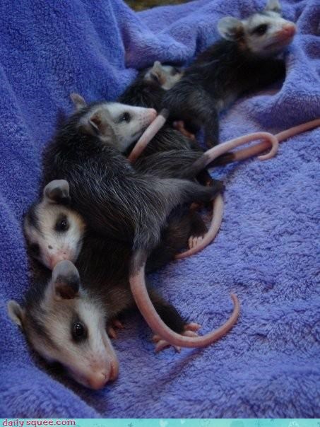 A litter of baby Virginia Opossums, too big for Mama's pouch!