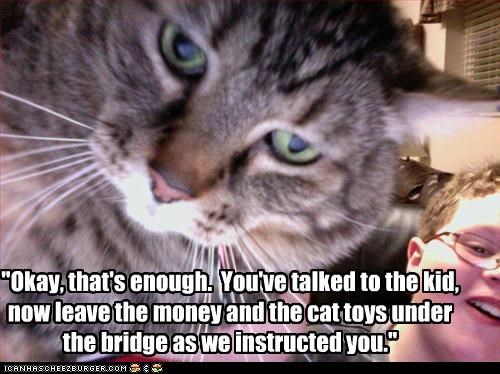 "Okay, that's enough. You've talked to the kid, now leave the money and the cat toys under the bridge as we instructed you."