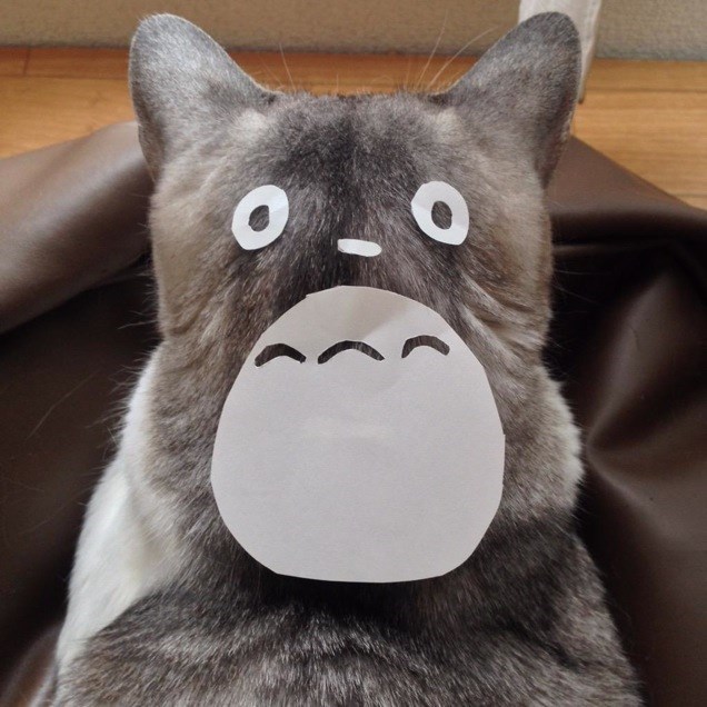 Using basic office supplies like paper, scissors, and tape, you can turn your kitty into a Totoro! Really, it's that simple. Just stick some paper on the back of the cat and it'll look just like a cuddly Totoro! Here are some photos for your inspiration.