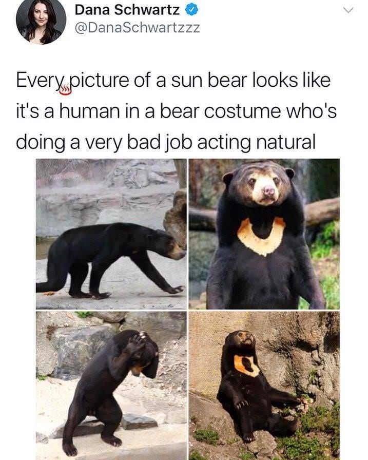 We're convinced that sun bears aren't real. They are too derpy. Look at these silly pictures - we're 70% sure that it's actually a man in a bear suit. There must be a zipper in there somewhere…