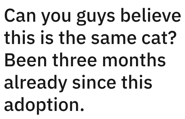 What a sweet baby! This glow-up is serious, they don't even look anything like the previous photo. A little love goes along way, especially with cats. They may not look like it, but they need love to survive just as much as we do!